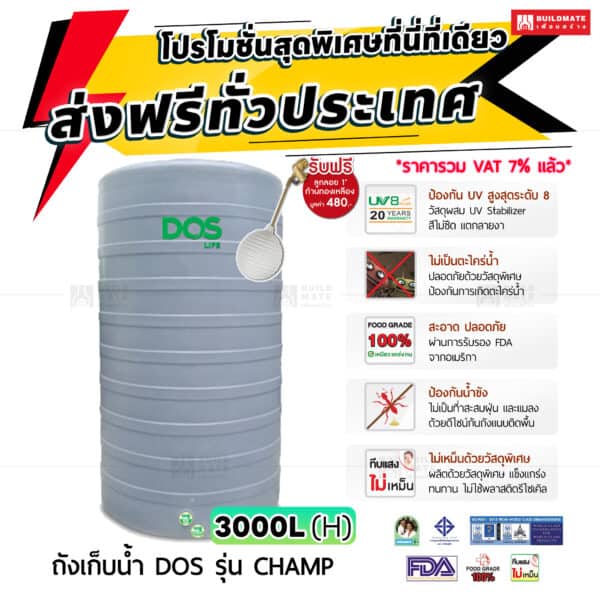 ถังเก็บน้ำบนดิน DOS รุ่น CHAMP 3000 (H) ลิตร (เทา)
